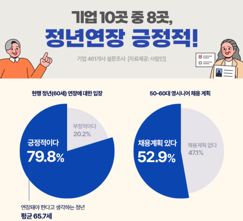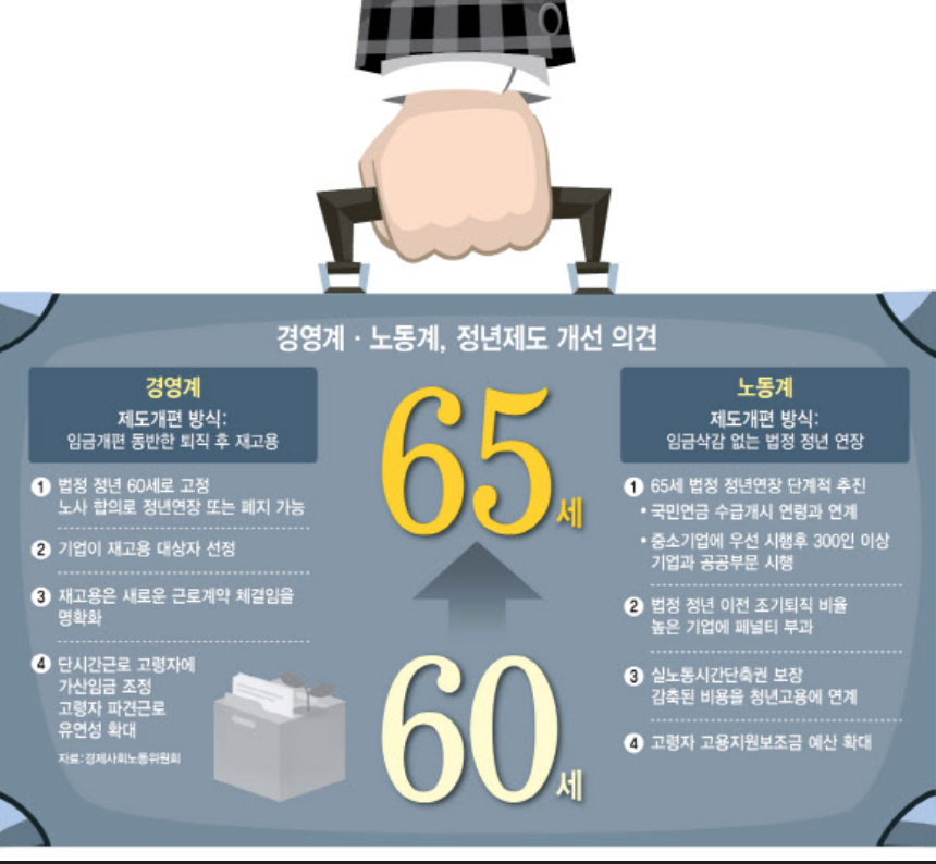 현재 논의의 핵심은 정년을 65세까지 확대하는 것입니다.
